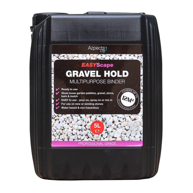 Azpects EASYScape Gravel Hold Multipurpose Binder (5L) is an easy-to-use gravel binder designed to securely bond loose aggregates while maintaining a natural appearance. This resin bonded gravel solution coats each stone with a subtle protective sheen, holding pebbles and gravel firmly in place while remaining fully permeable, allowing water to drain through the surface.