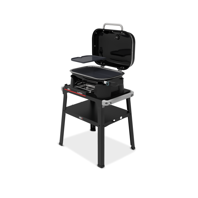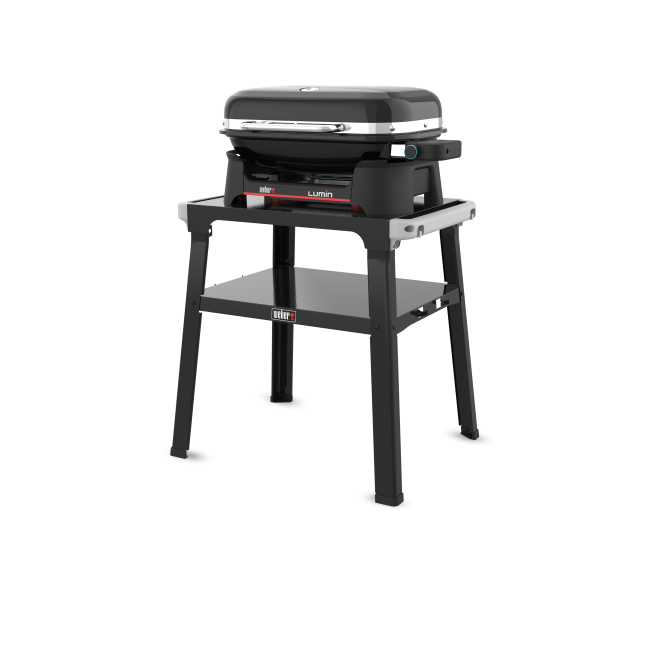 Enjoy delicious, char-grilled flavor without an open flame on the Lumin® Electric Outdoor Grill with Stand. Plug it in on your patio or garden and reach temperatures over 315°C in 15 minutes for flavorful sear marks on meat and seafood. Plus, explore more ways to enjoy cooking outdoors with the included griddle insert for flat top favorites like smashed burgers, pancakes and eggs, and stir-fries. The stand is easy to assemble and adds extra space with middle shelf storage and Weber Works rails for snap on accessories (sold separately). Versatile and modern, the Lumin® Electric Outdoor Grill with Stand offers big flavor with a small footprint.